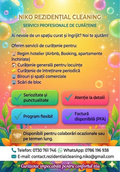 In anuntul pentru un serviciu de curatenie pe OLX.ro, poti raspandi un strop de magie prin includerea informatiilor esentiale si atragatoare. Fii precis si detaliat, mentioneaza tipul de curatenie oferita (generala, dupa evenimente etc.), suprafata pe care se va actiona, frecventa serviciului si orice caracteristici speciale. Insoteste anuntul cu fotografii captivante pentru a ilustra profesionalismul si calitatea serviciului tau, precum curatenie la domiciliu. Foloseste cuvinte potrivite pentru a transmite experienta unica pe care o oferi prin firma de curatenie. Cu OLX.ro, anuntul tau va straluci si vei atrage cu siguranta privirile clientilor interesati de curatenie impecabila si servicii de vis!