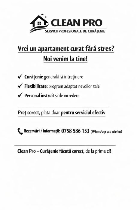 OLX.ro iti deschide usile catre o lume plina de avantaje in contactarea serviciilor de curatenie! Cu un strop de farmec, gasesti furnizori priceputi si pasionati sau firme de curatenie. Cu un simplu click, ai acces la o varietate de oferte atractive si promotii speciale. OLX.ro promoveaza comunicarea directa cu furnizorii de curatenie la domiciliu, astfel incat sa poti discuta detaliile si sa alegi solutia perfecta. Cu flexibilitate in programare si tarife accesibile, OLX.ro iti ofera experienta curateniei fara batai de cap. Alege OLX.ro pentru a aduce magia curateniei in casa ta si bucura-te de o viata mai stralucitoare si mai confortabila!