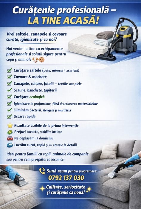 OLX.ro iti deschide usile catre o lume plina de avantaje in contactarea serviciilor de curatenie! Cu un strop de farmec, gasesti furnizori priceputi si pasionati sau firme de curatenie. Cu un simplu click, ai acces la o varietate de oferte atractive si promotii speciale. OLX.ro promoveaza comunicarea directa cu furnizorii de curatenie la domiciliu, astfel incat sa poti discuta detaliile si sa alegi solutia perfecta. Cu flexibilitate in programare si tarife accesibile, OLX.ro iti ofera experienta curateniei fara batai de cap. Alege OLX.ro pentru a aduce magia curateniei in casa ta si bucura-te de o viata mai stralucitoare si mai confortabila!
