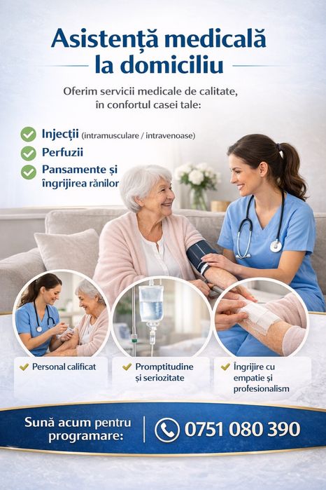 Vrei sa eviti sistemul medical public si ai nevoie de servicii medicale la domiciliu? Cauti o asistenta medicala, un infirmier care sa ingrijeasca pe cineva acasa ori ai nevoie de un stomatolog de incredere? Fie ca este vorba de o interventie in sistemul privat, de ingrijiri urgente sau de o colaborare pe termen lung pentru ingrijiri medicale la domiciliu, gasesti direct pe olx.ro serviciul medical dorit. Prin motorul nostru de cautare ai acces inclusiv la servicii medicale non-stop. Sunt vizate interventiile usoare, cum ar fi perfuzii, injectii, masuratori ale diverselor functii, teste sau pansamente. In plus, cu olx.ro economisesti bani, putand chiar sa contactezi studenti la medicina cu experienta.