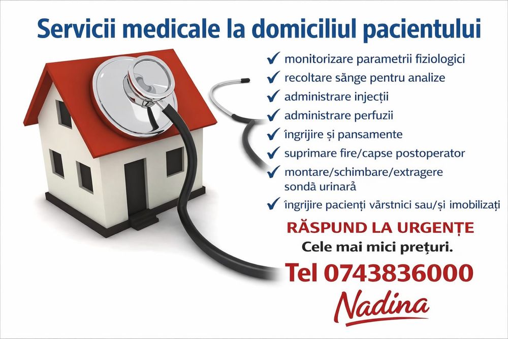 Vrei sa eviti sistemul medical public si ai nevoie de servicii medicale la domiciliu? Cauti o asistenta medicala, un infirmier care sa ingrijeasca pe cineva acasa ori ai nevoie de un stomatolog de incredere? Fie ca este vorba de o interventie in sistemul privat, de ingrijiri urgente sau de o colaborare pe termen lung pentru ingrijiri medicale la domiciliu, gasesti direct pe olx.ro serviciul medical dorit. Prin motorul nostru de cautare ai acces inclusiv la servicii medicale non-stop. Sunt vizate interventiile usoare, cum ar fi perfuzii, injectii, masuratori ale diverselor functii, teste sau pansamente. In plus, cu olx.ro economisesti bani, putand chiar sa contactezi studenti la medicina cu experienta.